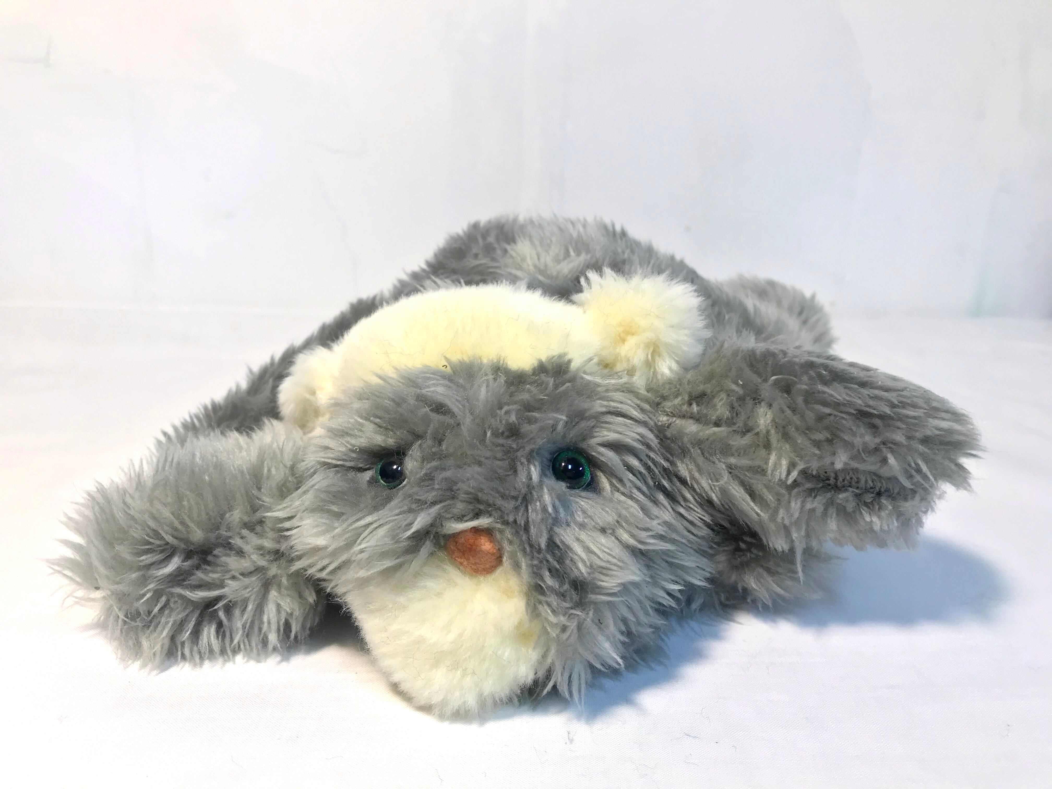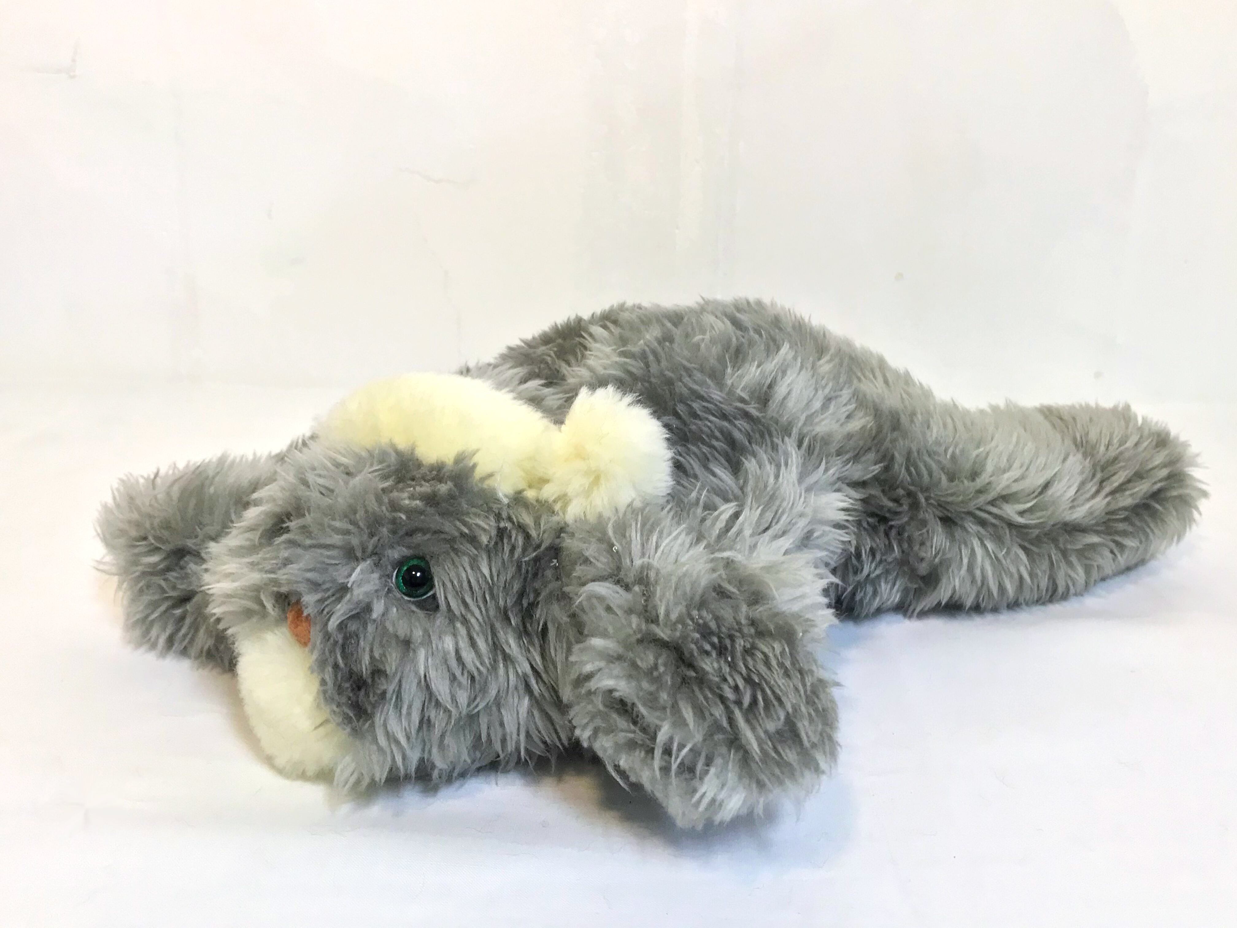 くたっとしている犬のぬいぐるみ。グリーンのつぶらな瞳が、ふわふわな毛から覗く。不完全のぬいぐるみ達の中では、今のところ、一番大きいサイズ。